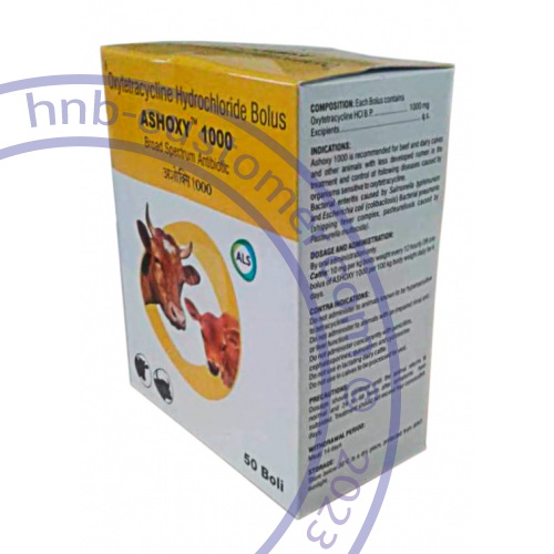 Ashoxy 1000® refers to antibacterial drugs of the tetracycline group for the treatment and prevention of bacterial diseases caused by microorganisms that are sensitive to oxytetracycline. Ashoxy 1000® is indicated for the treatment of bacterial enteritis caused by E.Coli, Salmonella, Cholerae suis, as well as for the treatment of bacterial pneumonia caused by Pasteurella multoclda. The drug is used in cattle for the treatment of respiratory infections, necrobacteriosis, abscesses, wound infections, postoperative and postpartum infections, mastitis, keratoconjunctivitis; sheep, goats for the treatment of enzootic abortions, pneumonia and peritonitis, foot rot, mastitis, umbilical sepsis, purulent arthritis, postoperative, wound and postpartum infections; pigs for the treatment of respiratory infections, MMA syndrome (mastitis - metritis - agalactia), swine erysipelas, mastitis, umbilical sepsis, purulent arthritis, atrophic rhinitis, abscesses, postoperative, wound and postpartum infections.