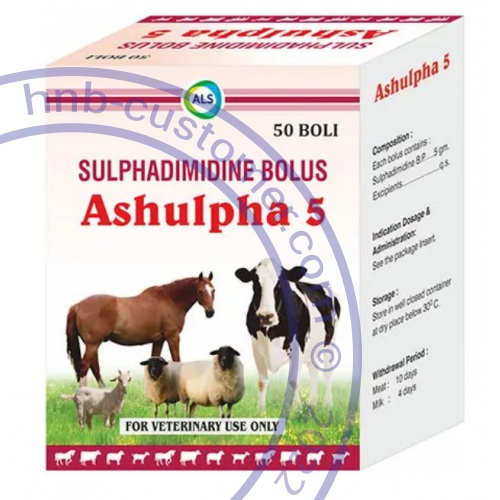 Ashulpha - tablets, containing 5mg of Sulfamethazine (Synonyms: Sulfadimidine; Sulfadimerazine), is an antimicrobial, antibacterial, bacteriostatic agent of the sulfonamide group. Sulfadimidine acts usually bactericidal against many Gram-positive and Gram-negative microorganisms like E. coli, Staphylococcus, Streptococcus, Salmonella, Pasteurella and Eimeria spp, so is used as a broad-spectrum antimicrobial to treat or prevent infections caused by susceptible organisms. Infections treated may include pneumonia, intestinal infections (especially coccidia), soft tissue infections and urinary tract infections (UTIs). Sulfadimidin affect bacterial purine synthesis, as a result of which a blockade is accomplished.