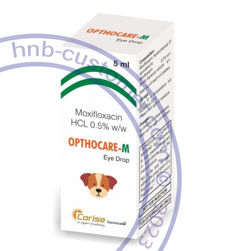 Opthocare – M eye drops contains moxifloxacin. It is a unique topical Anti-infective Eye Drops for dogs and cats. 1 Drop in the affected eye(s) 3 times daily for 7 days for bacterial conjunctivitis in adults and should not be prescribed to pets below the age of 1 year.