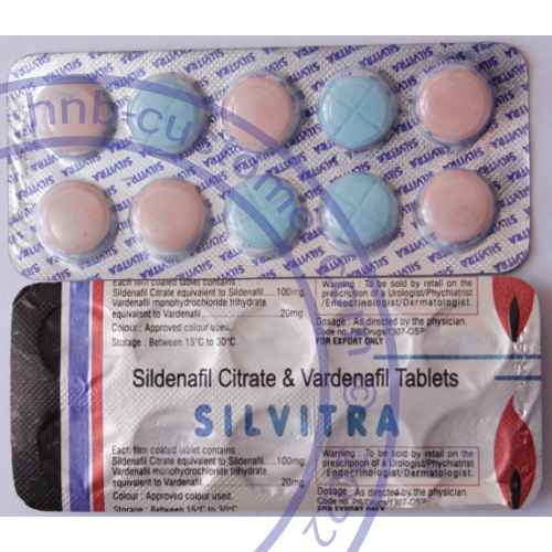 The SILVITRA TABLET tablet is administered orally to treat erectile dysfunction and impotency in men. Double Layer (Blue & Orange) uncoated round shaped tablets. One side of the tablet with a round shape has double cross lines and other side of tablet is plain packed in a pocket size blister strip of 10 (ten) tablets comes in Vardenafil 20mg and Slidenifal Citrate 100mg. For best results, take 1 tablet of SILVITRA TABLET at least 8 minutes if not one hour before the planned sexual intercourse. Do not consume more than 1 tablet in a day and always consult your doctor and pharmacist before beginning the course.Always check the patient information leaflet provided by your pharmacist with your supply and also each time you order refill, to ensure that you are fully aware about the efficacy and various contra indications of Vardenafil and Slidenafil Citrate. When in doubt or in need of clarification, consult your doctor or pharmacist before taking your dose. Always take SILVITRA TABLET exactly as your doctor has told you. You should check with your doctor or pharmacist if you are not sure.